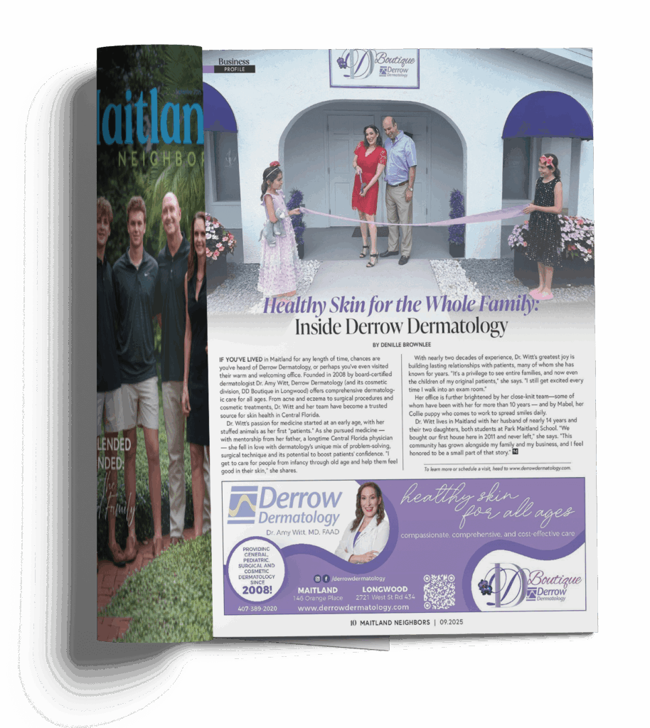 Derrow Dermatology was proudly featured in Maitland Neighbors Magazine, highlighting Dr. Amy Witt’s dedication to providing expert dermatologic care for families across Central Florida.
